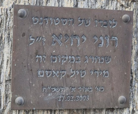 ביום רביעי כ"א באדר א' תשס"ח (27.02.2008), אחר הצהריים, סיים רוני יחיא בן ה-47 ללמוד והיה בדרך לרכבו שחנה במגרש החניה של מכללת ספיר, נשמעה אזעקה בשל ירי קסאם מרצועת עזה. מיד אחר כך נחתה הרקטה והתפוצצה מטרים אחדים מרוני, שנפצע באורח אנוש מרסיס בלבו. הוא הועבר לבית החולים באשקלון, אך שם מת מפצעיו כעבור זמן קצר. צילום: עמית מנדלסון
