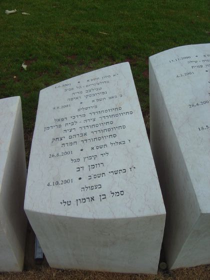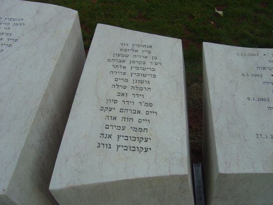 על אבני השיש מצויינים אירועי הטרור והאיבה השונים ושמות בני העיר שנפלו חלל באותו אירוע.