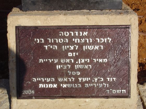 בראשון לציון חברו ראש העיר מאיר ניצן וארגון יד לבנים ובני המשפחות השכולות של חללי הטרור כדי להקים אנדרטה מרכזית עירונית לחללי הטרור בני העיר ראשון לציון.