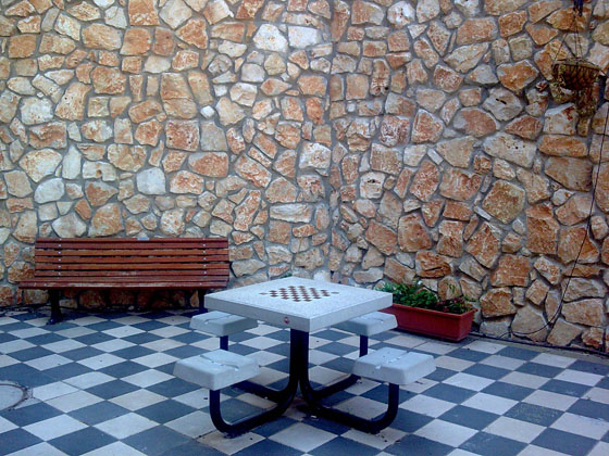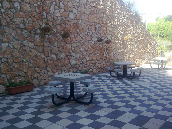 הגן כולל : גינה עם שבעת המינים ופינת משחקים מרוצפת עם שולחנות שח / שש-בש וספסלים.