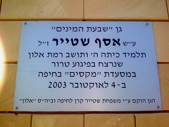 לזכרו של אסף שטייר הוקם גן "שבעת המינים" בבית ספר "אלון" ברמת אלון, חיפה. אסף למד בבית ספר זה מכתה ג' עד כתה ה' (2001-2003).