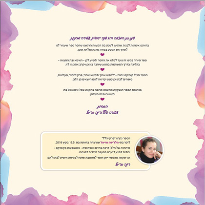 הספר מוקדש לעילוי נשמת הלל יפה אריאל הי"ד אשר זכתה לחוות שנת בת מצווה נפלאה ורבת משמעות. הספר מתחיל בקומיקס המותאם לבת מצווה. הקומיקס מפגיש את הנערה עם דמותה הייחודית של הלל יפה אריאל הי"ד – תכונותיה, מעשיה והאתגרים שעימם התמודדה כנערה בגיל מצוות. אנו תקווה שתוך כדי הקריאה בקומיקס תוכל הנערה להתחבר לעצמה ולפנימיותה. לקריאה על הספר והורדת פרק התרשמות לחצו על הלינק.