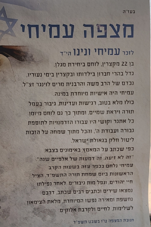 ביישוב אלון מורה בו למד עמיחי ונינו גם הוקם מצפה. "סמוך לישיבה הגבוהה 'ברכת יוסף' בה למד עמיחי, וממנה התגייס לצה''ל. הליכה של חמש דקות על שביל 4 על 4 בשביל ירוק ופורח, וקצהו המצפה הצופה על עמק בין דגן והעיר שכם ופרבריה".