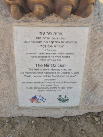 אנדרטה חדשה של הפסל סם פיליפ, בדמות אריה, הוצבה בשדות בין קיבוצי ניר עוז ומגן. זו אינה הנצחה ספציפית, אבל מהווה זכרון לאירועי ה-7 באוקטובר.
